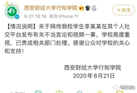 6月21日,西安财经大学行知学院在其官方微博发布一则“情况说明”称,关于该校学生李某某在社交平台发布不当言论和视频一事,已责成相关部门处理。