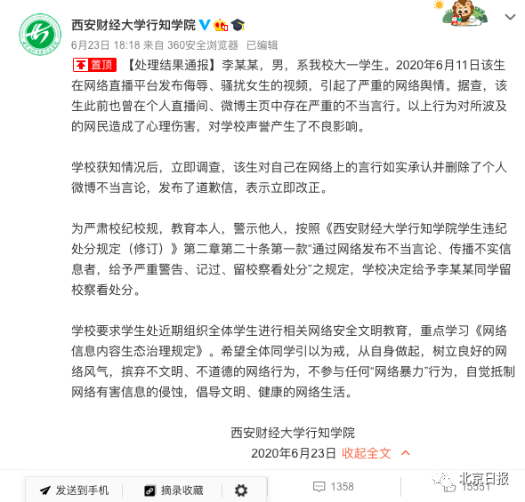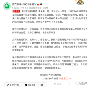 6月23日下午,西安财经大学行知学院发布处理结果通报,宣布对日前直播搭讪嘲笑女生的涉事大学生李某某给予留校察看处分。