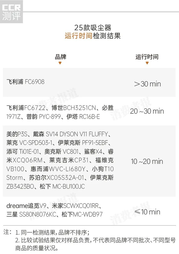 结果显示,25件吸尘器的运行时间差别悬殊,其中有1款飞利浦 FC6908运行时间长达34分钟,是唯一1款超过30分钟的吸尘器。
