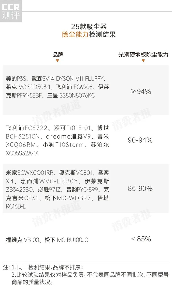 结果显示,美的、戴森等6款吸尘器的光滑硬地板除尘能力都在94%以上,表现优秀。而福维克、松下等2款吸尘器表现较差,除尘能力均<85%。