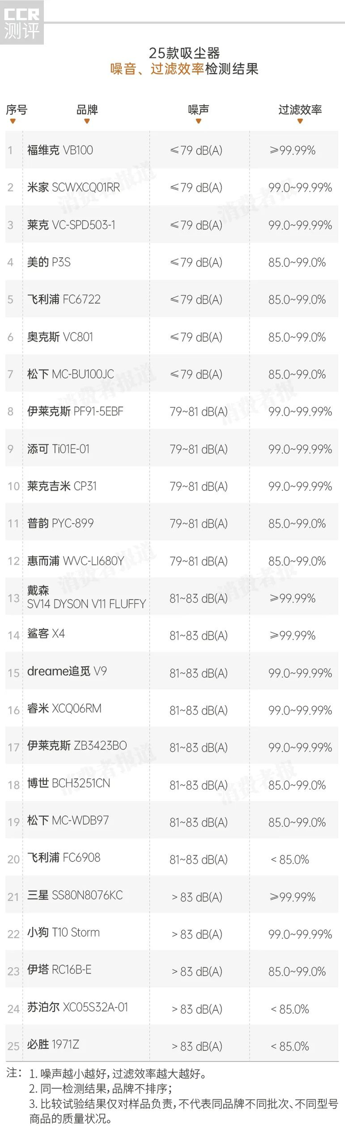 结果显示,25款吸尘器的噪音都较大,噪声最大为85.2 dB(A),最小为75.7 dB(A);过滤效率最高为99.998%,最低为67.125%。