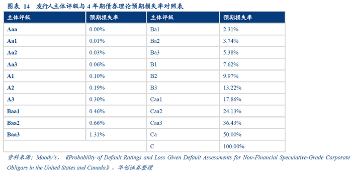 企业的违约概率可以由4年期债券理论预期损失率计算得到,企业违约概率PD=4年期债券理论预期损失率/企业整体期望违约损失率LGD。4年期债券理论预期损失率可以对照下表,根据主体评级得到。