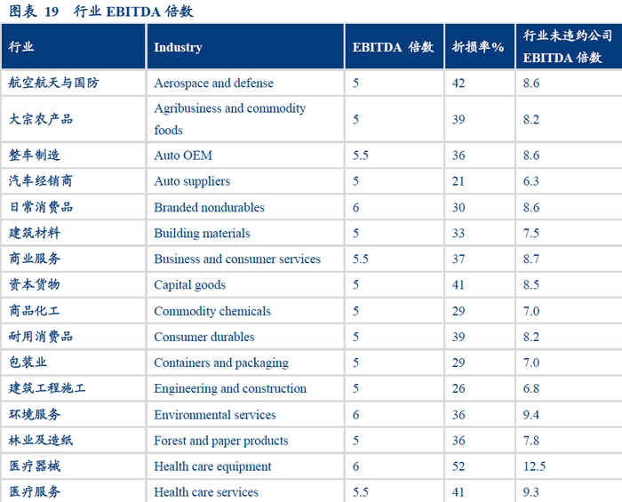 中性假设之下,行业环境没有改善或者宏观经济仍然低迷,公司收入增长率持续下降,现金流规模收缩,在债券到期前公司很有可能会触发保护性条款(例如财务杠杆过高,违反了条款约定,债务人被要求立即偿还债务),发债主体被迫出售公司来偿还债务,此时,公司的市盈率处于低位,但是收购者认为公司具有潜力,经过重组等方式可以在未来获得收益。在此情况下,EBITDA倍数法更适合企业估值(企业价值=EBITDA*EBITDA倍数)。但是,EBITDA倍数不是固定的,即将或已经违约企业的EBITDA倍数一般比行业内稳健经营的企业EBITDA倍数要小,因此对于EBITDA倍数要经过一定的调整,调整后的EBITDA倍数(可参考图表19行业EBITDA倍数)更贴近实际企业违约后的数值。