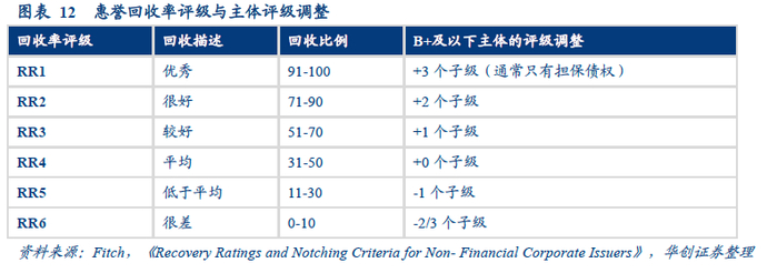 5、得出回收率评级:根据债券回收比例,得出回收率评级,再在发债主体评级的基础上进行子级的加减调整,得到债项评级。例如,若主体惠誉评级为B-,债券回收率为100%,根据惠誉回收率评级标准(图表12),债券评级在B-的基础上上调3个子级,最终得到此债券评级为BB-。