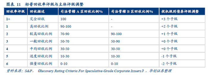 标普回收率评级与主体评级调整标普和惠誉的回收率评级级别设置不同,标普根据回收情况由高到低设置7个级别,惠誉设置6个级别。特别的是,标普根据各国和地区的破产制度对债权人的友好程度对司法管辖区域进行评估,分为A、B、C三组:A组具有可靠的破产制度,债权之间的优先级别关系明确,回收率可预测且预期回收率较高,因此债券评级调整上限为3个子级;B组的破产制度的执行力、可预测性稍逊于A组,可能会限制债权人的追偿,因此债券评级级别的调整上限不会超过两个子级;C组的破产制度对债权人优先级别的设置与国际不一致,债权之间没有明确的区分,具有很高的法律风险,回收率难以预期,因此下表不适用。目前,标普公开的评估结果中,A区包括荷兰、爱尔兰、芬兰、丹麦、新加坡、中国香港地区、澳大利亚、英国、挪威、瑞典、南非、德国、比利时、卢森堡、瑞士、日本、葡萄牙、加拿大、美国;B区包括西班牙、土耳其、墨西哥、智利、法国、意大利、巴西;C区包括俄罗斯、哈萨克斯坦、乌克兰。标普还未评估中国大陆地区的破产制度,我们根据A、B、C组的分类标准,结合当前的中国大陆地区债券市场的司法现状,推测中国大陆地区属于司法管辖B或C区。