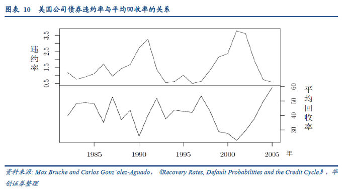 历史数据表明债券违约率与回收率之间是负相关的(如下图所示),负相关关系成因有二,一是系统性风险(经济周期)。当系统风险高时,债券违约率上升,债权人能回收的债券价值主要取决于公司资产的价值,而资产在经济下行时会贬值;二是违约债券供需关系。违约债券的供需关系决定了违约债券的价格,违约后不久的债券的价格被认为是最终回收率的贴现。当债券违约率高时,投资者倾向于立即抛售手中的债券,而接盘者较少,相应地,回收率就低。