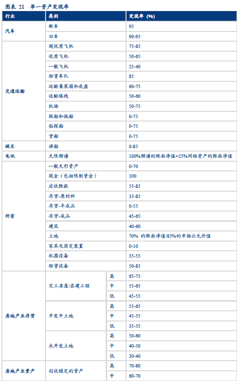 如上文所述,单一资产估值法适用于资产密集型企业或者即将破产清算的企业。单一资产估值法的主要原理是,企业违约后,其资产的账面价值、评估价值或者市场价值会发生减值,从而可以得到资产变现率。四、企业违约后破产清算价值——单一资产与特殊行业(房地产)估值。