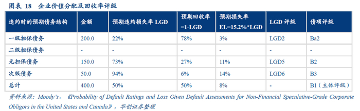 (iii)计算各项债务工具的预期损失率,得到各债务工具的评级。根据waterfall法,将企业估值逐级分配给各债务工具的预计风险敞口。各项债务工具的预期损失率(EL,Expected Loss)=各债务的期望违约损失率LGD*企业违约概率(PD,Probability of Default)。然后,根据各项债务工具的预期损失率,可以得到各债务工具的LGD评级。各债务工具的最终评级则由穆迪综合LGD评级以及其他信用基本面判断来给出最终评级。