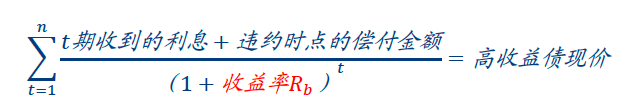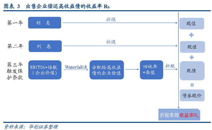 在中性假设下,假设企业在第三年触发保护性条款,进行破产重组,出售企业来偿还债务,企业的EBITDA=100万,估计EBITDA倍数为5.5,预估破产费用50万,分别将第一年与第二年的利息,以及第三年获得的偿付金额折现得到现值,计算折现率即收益率Rb=3.5%,使得现值加总等于高收益债现价60元;