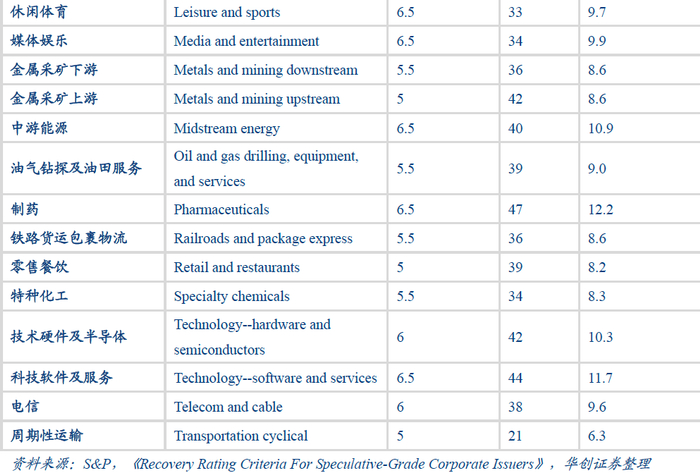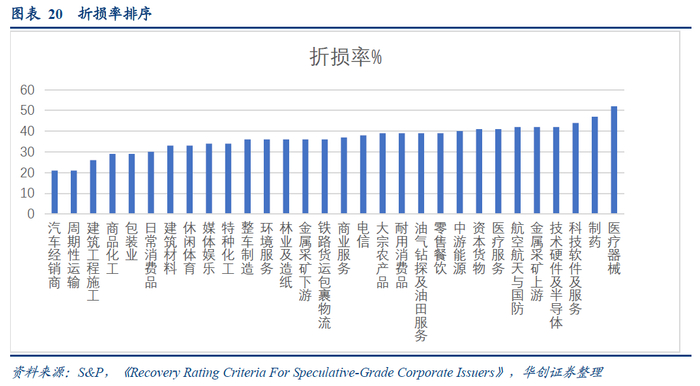 虽然折损率与违约回收率不是严格的互为倒数关系,但二者基本是负相关的关系。通过对折损率的排序,可以发现处于下游的行业大多折损率比起上游行业的要低,即下游行业的违约回收率大多表现较上游要好一些。例如:汽车经销与整车制造,金属采矿下游与金属采矿上游,医疗服务与制药和医疗器械,包装业与林业造纸;同时,重资产行业的折损率要高于轻资产行业,例如汽车经销商、休闲体育、媒体娱乐等是轻资产行业,而折损率较高的是航空航天、金属采矿、医疗器械等重资产行业。因为债券违约后,企业资产价值往往会贬值,这是影响回收率的关键因素,但是,这两点并不能完全解释折损率的排序,主要是因为折损率的影响因素有多个,特别是与当时行业景气度相关的因素影响较大。