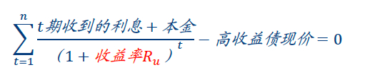 在乐观假设下,5年期高收益债顺利到期偿付,分别将每张债券的每期利息7元以及最后一期的本金100元折现得到现值,计算折现率即收益率Ru=20.5%,使得现值加总等于高收益债现价60元;