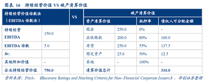 在持续经营假设下,企业价值=企业EBITDA*EBITDA倍数+其他附加价值,在破产清算假设下,企业各项资产的清算价值*抵押率=债权人可分配的金额,债权人可分配金额加总为310,小于持续经营假设下的企业价值750,故选择持续经营假设下的企业价值。