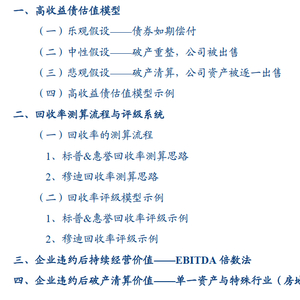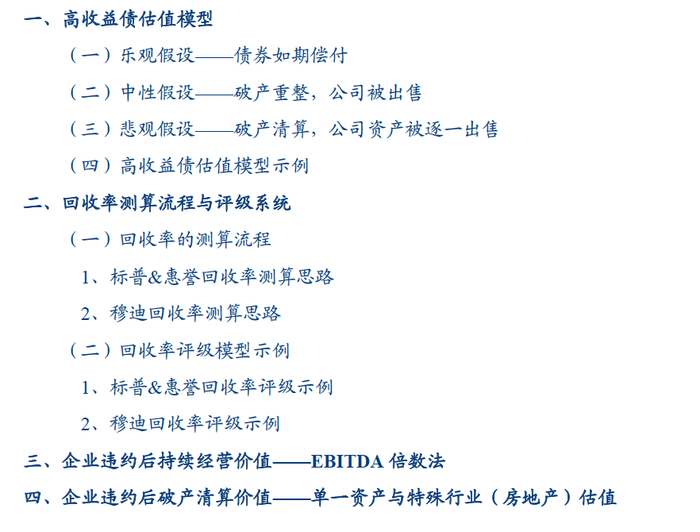 估值可以视为一切投资逻辑的核心,高收益债也同样如此。高收益债的估值定价是以回收率为基础的。不同于普通债券主要以利率债基准加利差定价的方式,高收益债更侧重于企业估值或资产估值能覆盖多少相关债务。以美国为主的海外高收益债市场便是在基于回收率的测算,对投机级债券进行回收率评级,从而对给予估值定价方向。高收益债估值模型的主要原理是假设在不同情况下,对企业价值进行评估,再按各级债务的求偿顺序,计算违约时企业对各级债务的覆盖情况,从而计算出债券回收率,结合主体评级给出回收率评级,进而指导债券定价。