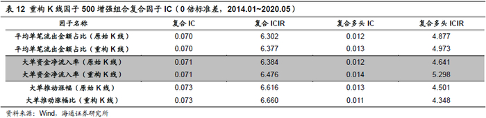 由上表可见,K线重构方法在中证500中对于三个因子选过效果提升较为明显,并且无论在中证500还是全市场范围内,都会对于单因子多头选股效果有进一步的加强。