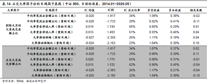 由于大单因子有更强的截面选股效果,在这里我们将K线因子分别与两个大单因子正交,考察其剥离大单因子影响后的选股效果,以及不同K线因子与大单因子的相关性情况。具体情况如下表: