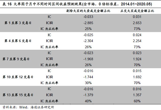 这篇报告我们更多依然以构建传统月频选股因子为目标,但我们如果观察两个表现较好的大单因子:剔除大买的大卖成交金额占比与正交大买成交金额占比因子,对于月中不同区间内收益的预测效果,如下表: