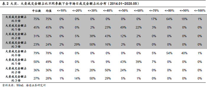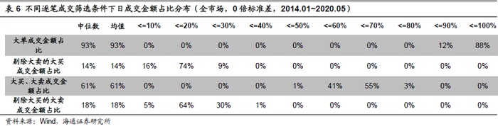 下表统计了不同过滤参数下,全市场所有股票过滤后所保留的成交金额占全天成交金额比例的分布情况。其中,中位数、均值即全市场所有股票按照该过滤条件过滤后保留成交金额占比的中位数与均值,而<=10%,<=20%则表示过滤后成交金额占比在0%到10%,10%到20%之间的股票占全市场所有股票的比例。