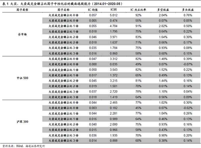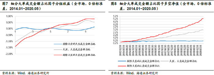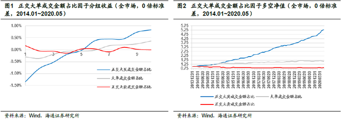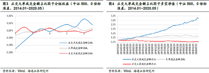 为了进一步揭示大买成交金额占比因子的选股能力来源,我们以0倍标准差为过滤参数,尝试构建大单成交金额占比因子,即买单或者卖单为大单的所有成交金额占全天成交额比例。同时,我们将大买成交金额占比因子、大卖成交金额占比因子分别与大单成交金额占比因子进行正交,考察剥离大单金额占比影响后,大单买卖意愿,是否有较好的截面选股能力。