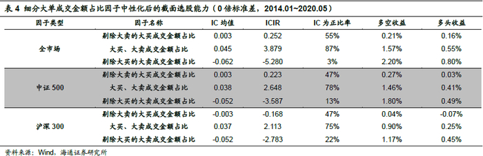 进一步考察大买或大卖订单参与重构方式在中证500与沪深300中选股效果如下表: