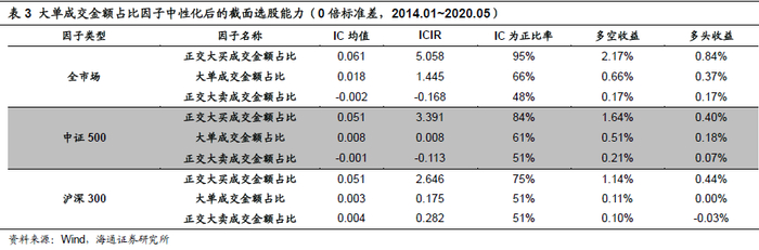 从截面选股效果来看,当同时由大买单与大卖单促成的成交额占比较高时,有显著的正向选股效果,而当大卖单与小额订单促成成交额占比较高时有较好的负向选股效果,大买单与小额单促成成交占比较高时,选股效果并不明显。