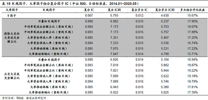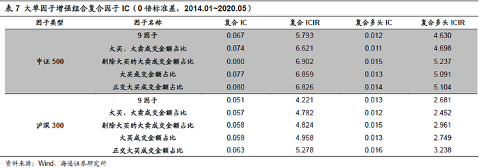 通过上文分析,我们得到大买成交金额占比因子,剔除大买的大卖成交金额占比因子,大买、大卖成交金额占比因子以及正交大买成交金额占比因子是我们发现的有较强选股能力因子。我们尝试将这些因子加入常用的市值、估值、盈利、换手等九个风格因子当中构建中证500与沪深300增强因子组合,考察其复合因子IC情况如下表: