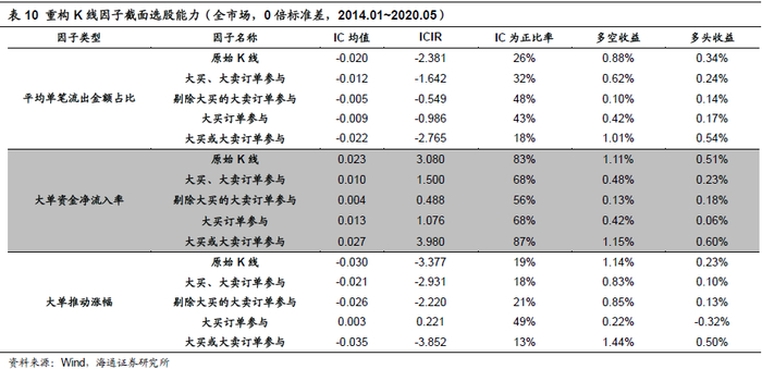 由上表可见,相比较用原始K线所构建的因子,只有利用保留了大买或大卖订单参与这种过滤方式重构K线所构建的三个因子有明显的效果提升,剩下过滤方式构建因子截面选股效果均有所减弱。