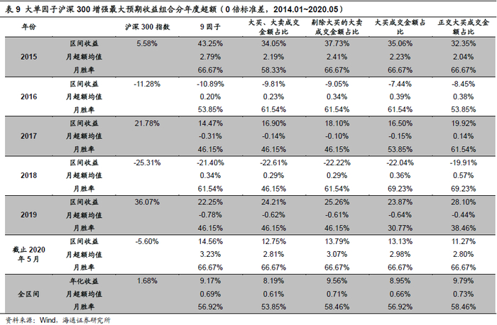 对于300增强组合而言,叠加正交大买成交金额占比因子所构建的组合表现最为强势。对应沪深300增强组合分年度表现如下表: