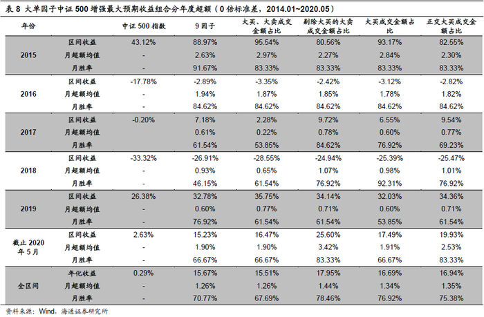 这可能是由两方面原因造成,首先,相比较其它过滤方式,保留了大买或大卖订单参与的成交这种方式可以最大程度的保留当天的成交信息。如表6所示,该方式相比较大买、大卖订单参与这种过滤方式,平均多保留了30%的成交信息。其次,保留大买订单参与或者剔除大买的大卖订单参与在剔除了更多成交信息同时,也让所保留信息带有一定的正向或负向选股效果,而这种效果有可能与基于分钟K线的因子构建模式冲突,从而对于该因子最终的选股效果有进一步的干扰。