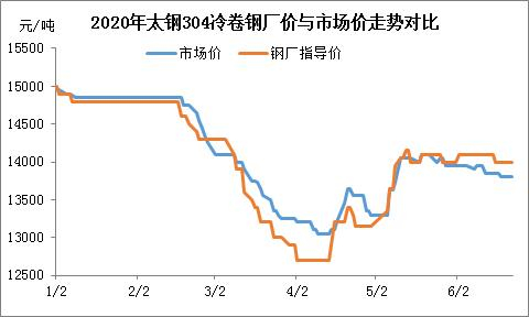 2020年上半年行情来看,整体呈现跌后反弹态势,进入五月下旬行情有所趋弱。截止6月23日,无锡地区太钢304/2B冷卷上半年市场均价在14058.26元/吨,较2019年同期下跌5.09%,价格重心继续下移。