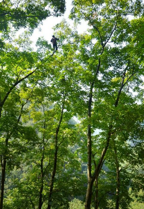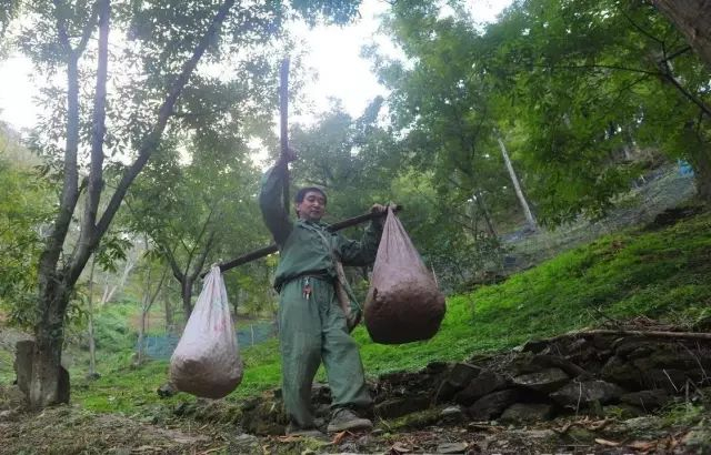 爬上10-20米的高树,借着竹竿的巧劲打核桃,一敲一个准。