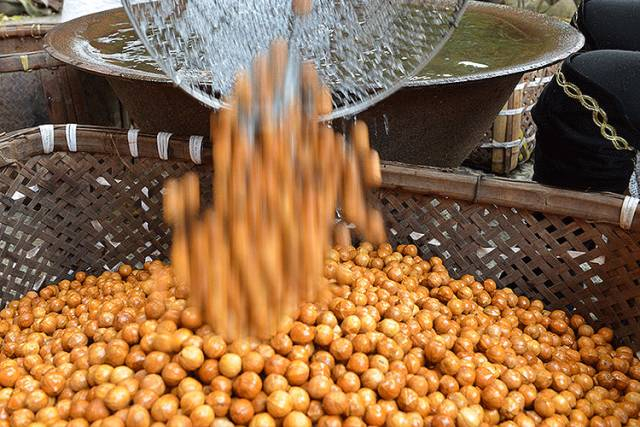 古法制作特别麻烦,从挑选、去壳、制作需要经历12道复杂工序。山泉水浸泡和芝麻粉去涩。2次山泉浸煮要足足8小时。