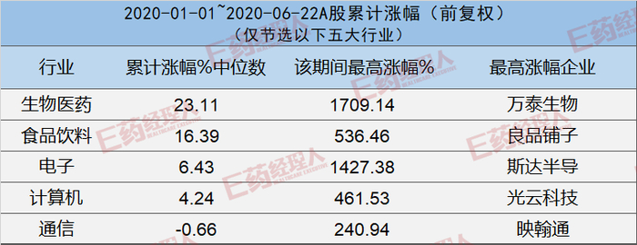 据choice数据,截止2020年6月22日,A股累计涨幅排行榜中,生物医药板块累计涨幅中位数为23.11%,从统计学上大致有一半以上的公司2020年来涨幅都在该数值以上。换个逻辑,对于投资者来说,该板块有329家企业,只要从超过的165家中任选其一,今年都能收获超过20个点的涨幅。疫情之下,只有生物医药和消费有如此待遇,而其他行业譬如一直被长期看好的计算机、电子、5G等细分领域整体表现十分惨淡。
