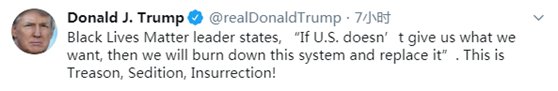 几分钟前,特朗普曾在另一条推文中就一名“黑人的命也是命”领导者的采访发表评论。他在推文中写道:“一位‘黑人的命也是命’领导者表示,‘如果美国无法带来我们想要的,那我们将会焚毁这个系统并取而代之’。这是叛国、煽动叛乱、暴动!”↓