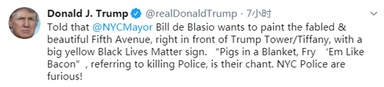 “我被告知纽约市长白思豪想把特朗普大厦前著名又漂亮的第五大道涂上‘黑人的命也是命’的黄色标语。他们的口号是‘裹在毯子里的猪,像炸培根一样炸他们’,说的是杀害警察的事。纽约警察很生气!”↓