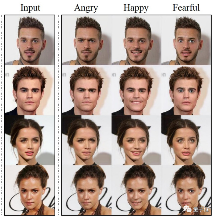 在StarGAN里,“乙方画师”生成器多了一项技能:听从甲方爸爸的需求,根据“男性”、“女性”、“开心”、“难过”等人物标签,把一个人画成性别、情绪不同的样子。