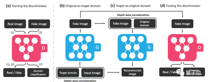 就像五角星的中间可以连接五个角一样,处在中间位置的生成器,可以连接多个域,画出同一个人物喜怒哀乐、是男是女、金发黑发等不同情况的图片。