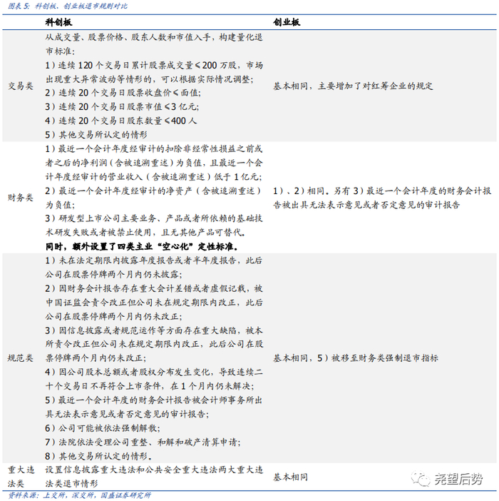 创业板注册制改革主要健全了退市机制,加快劣质企业出清。对比科创板,主要增加了对红筹企业的安排。1)丰富完善退市指标,将净利润连续亏损指标调整为“扣除非经常性损益前后孰低的净利润为负且营业收入低于1亿元”的复合指标,并新增“连续20个交易日市值低于3亿元”的交易类退市指标和“信息披露或者规范运作存在重大缺陷且未按期改正”的规范类退市指标等。加大“僵尸”企业和空壳公司的出清力度。2)简化退市流程,取消暂停上市和恢复上市环节,交易类退市不再设置退市整理期,提升退市效率,优化重大违法强制退市停牌安排,保障投资者交易权利。3)强化风险警示,对财务类、规范类、重大违法类退市设置退市风险警示制度。