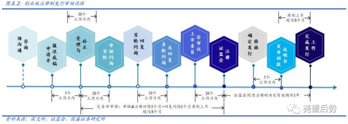 其次,发行流程上,也大致流程与科创板相同,区别在于创业板规定交易所审核+证监会注册的时间总计不超过三个月,较科创板以及此前征求意见稿的交易所审核3个月+证监会注册20天的规定,期限再次缩短。
