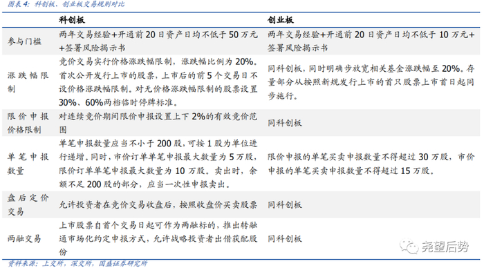 交易制度方面,创业板主要有五大变化:1)放宽涨跌幅比例,将创业板股票涨跌幅限制比例由10%提高至20%,并且同步放宽相关基金涨跌幅至20%。存量部分将随按照《创业板首次公开发行股票注册管理办法(试行)》发行上市的首只股票上市首日起施行。2)优化新股交易机制,对创业板新股上市前五日不设涨跌幅限制,并设置30%、60%两档停牌指标以稳定价格防止过度波动。3)引入盘后定价交易方式,允许投资者在竞价交易收盘后,按照收盘价买卖股票。4)优化两融制度机制。创业板注册制下发行上市股票自首个交易日起可作为两融标的,推出转融通市场化约定申报方式,允许战略投资者出借获配股份。5)优化其他微观机制安排。包括设置单笔最高申报数量上限,对连续竞价期间限价申报设置上下2%的有效竞价范围,调整交易公开信息披露指标,新增股票特殊标识等。