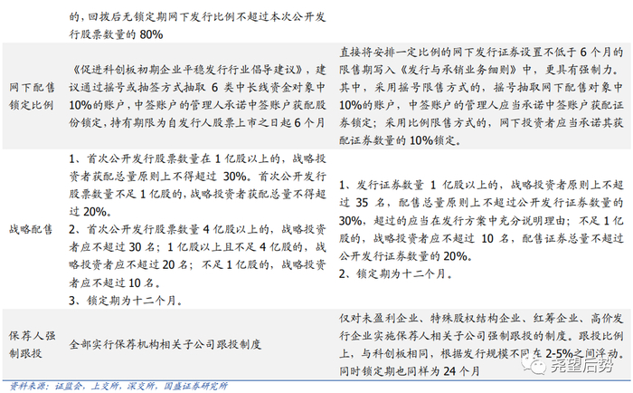 第五,在参与打新被锁的风险上,根据《促进科创板初期企业平稳发行行业倡导建议》,建议通过摇号或抽签方式抽取6类中长线资金对象中10%的账户,中签账户的管理人承诺中签账户获配股份锁定,持有期限为自发行人股票上市之日起6个月。而创业板直接将安排一定比例的网下发行证券设置不低于6个月的限售期写入《发行与承销业务细则》中,更具有强制力。其中,采用摇号限售方式的,摇号抽取网下配售对象中10%的账户,中签账户的管理人应当承诺中签账户获配证券锁定;采用比例限售方式的,网下投资者应当承诺其获配证券数量的10%锁定。