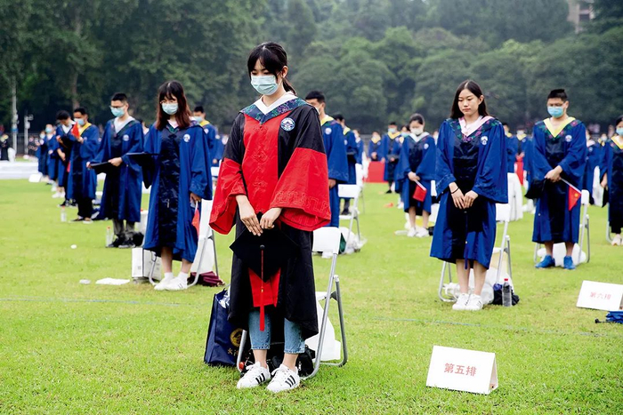6月20日,武汉大学参加毕业典礼的师生为新冠肺炎牺牲烈士和逝世同胞默哀。当日,武汉大学举行一场特殊毕业典礼,660名毕业生代表在现场拨穗正冠,未能到场的毕业生则通过观看5G直播方式“云”聚珞珈,共同见证自己的毕业盛典。图/中新