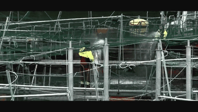 养殖场工人向三文鱼网箱里喷洒杀虫剂。图据ARTE