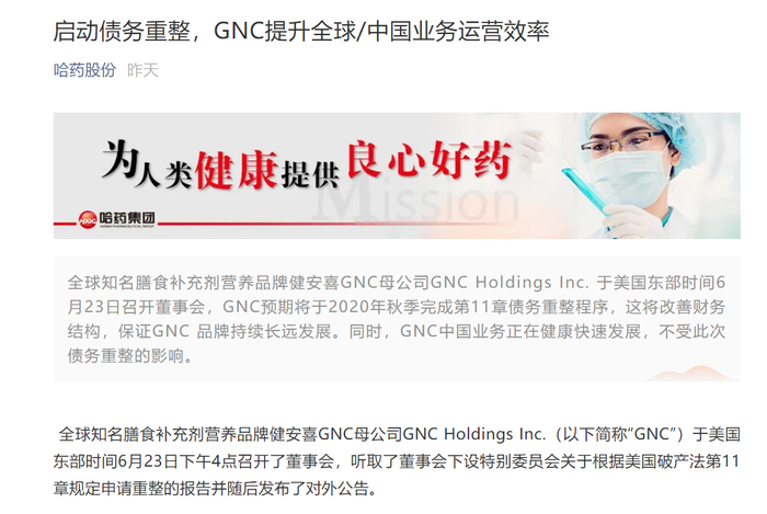 哈药股份官方发布关于GNC申请债务重整的消息