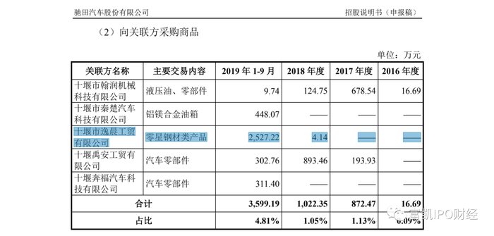 招股书显示,2019年1-6月,驰田汽车股份向十堰市逸晨工贸有限公司的采购额为2915.27万元,而在随后的关联方采购商品的数据中,却显示为2527.22万元。