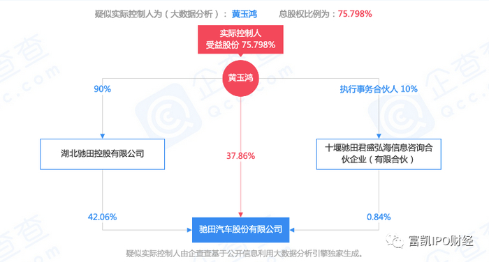 驰田汽车股份有限公司成立于2002年8月,黄玉鸿、黄村武、驰田装备通过召开股东会议正式成立了驰田有限,此为驰田股份的前身,而黄玉鸿与黄村武之间为叔侄关系。公司经过多年经营和增资后又“黄氏三兄弟”黄玉鸿、黄玉舜、黄玉钵通过湖北驰田控股有限公司(以下简称“驰田控股”)控制,分别在驰田汽车股份公司分别担任董事长、总经理,副董事长,董事、副总经理。其中,公司实际控制人黄玉鸿直接和间接控股比例为75.79%,处于绝对控股地位。