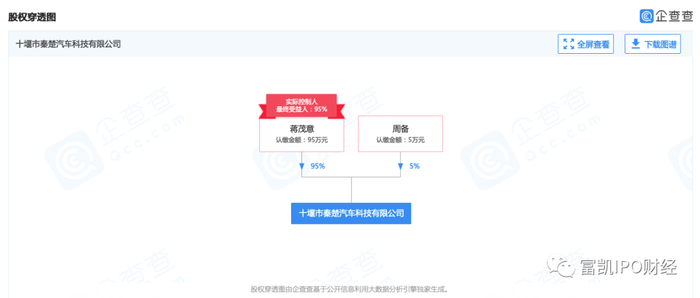 富凯IPO财经查看驰田汽车股份招股书显示,十堰市秦楚汽车科技有限公司 ,公司董事长、总经理黄玉鸿的侄子黄村翰实际持有 100%股权 。富凯IPO财经通过企查查查询显示十堰市秦楚汽车科技有限公司 并非是黄村翰,而是另外两位自然人股东——蒋茂意、周备。蒋、周二人分别持有秦楚汽车95%和5%的股权。