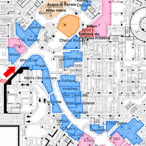 最近,《华丽志》探访了上海国金中心商场(IFC),这里地下二层的中庭空间(下图所示蓝色区域)在短时间内一下子冒出了一批国际高端香水品牌的独立门店: