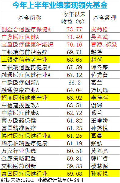 Wind数据显示,截至6月24日收盘,暂时领先的创金合信医疗保健行业基金收益率为73.77%,广发医疗保健、宝盈医疗健康沪港深两只基金分别以71.49%、70.16%收益率位居二、三名,与头名相差两三个百分点,两个交易日的涨跌仍然有可能改变现有名次。
