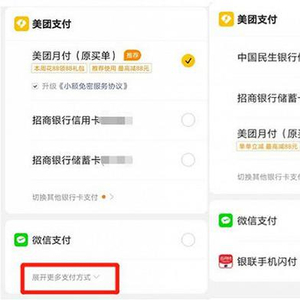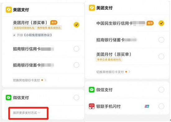 在美团系APP的支付界面上,美团支付被默认为首选,其次是微信支付。支付宝原本被隐藏,用户必须点击“展开更多支付方式”,才能看见(左图)。如今在安卓手机端,支付宝已经被彻底下线(右图),但苹果手机上还未有变动。