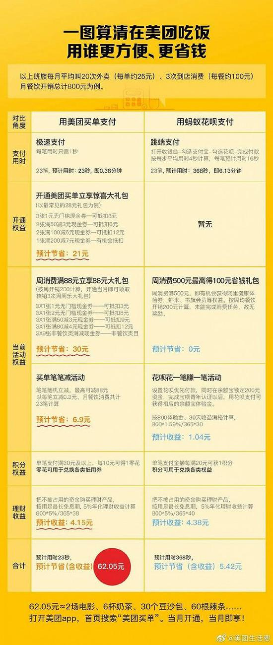 “月付”上线后,美团刻意对比了“月付”和“花呗”,结论当然是“月付”完胜。这不禁让人想问,既然“月付”那么好,为何下架支付宝?